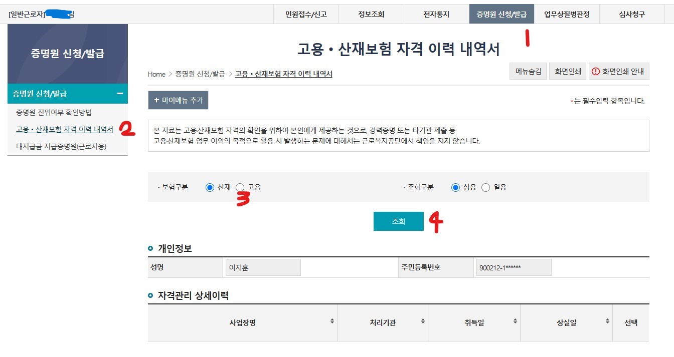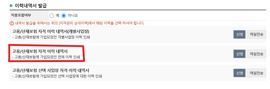→ 증명원 신청/발급 → 고용산재보험 자격이력 내역서 신청