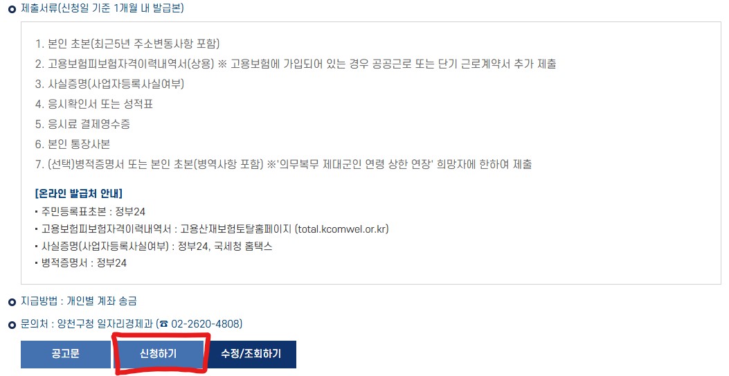 양천구의 경우 청년 국가시험 지원사업을 소개하는 페이지 가장 하단에 신청하기 버튼이 있었습니다.